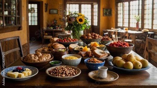 A sunlit table celebrates global longevity breakfasts, with vibrant plates of whole grains, fruits, veggies, nuts, and seeds—colorful, fresh, and artfully arranged in a warm, inviting setting.