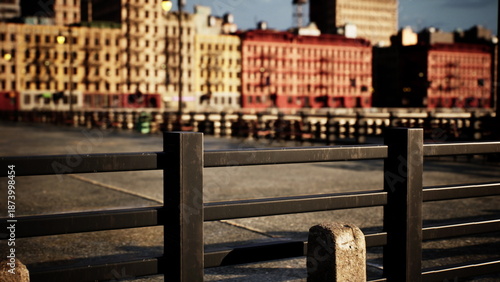 A sunny evening scene shows a waterfront with a focus on a sturdy railing. Colorful buildings rise in the background, glowing in warm light as the sun sets.