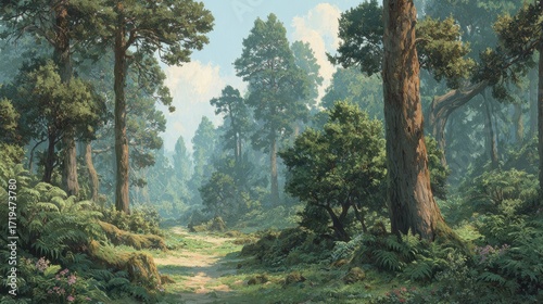 forest, tree, pathway, green, nature, wood, landscape, scenery, foliage, fern, moss, sunlight, tranquil, serene, peaceful, trail, vegetation, wilderness, outdoors, environment, scenic, adventure, summer, spring, growth, bark, branch, canopy, ecosystem, haze, dreamy, verdant, dense, tall, lush, ancient, wild, aethereal, fresh, light, shadow, flora, sky, cloud, evergreen, mystery, calm, beauty