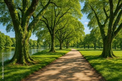 A sunny summer day with a dirt trail winding through a lush green park, surrounded by vibrant moss-covered trees