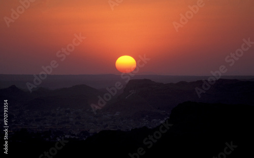 a sunset in the Thar Desert near the Town of Jaisalmer in the Province of Rajasthan in India. India, Jaisalmer, January, 1998