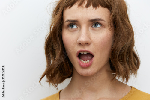 a surprised, shocked woman in a yellow T-shirt stands on a white background and looks up with her mouth wide open. Horizontal Studio Photography