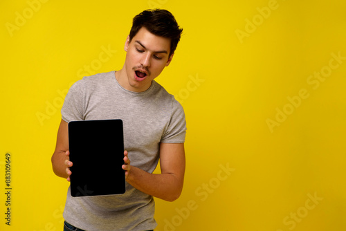 tablet, screen, surprise, amazement, amazement, reaction, yellow background, technology, contraption, hold, look, racked, portrait, studio, model, casual attire, male, caucasian, indoor, display, blank screen, isolated, man, young, happy, amazed, astonished, shocked, surprised, thrilled, excited, device, digital, holding, showing, yellow, person, guy, human, people, adult, lifestyle, cyberspace, electronic, touch screen, computer