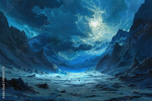 blue, sky, cloud, mountain, range, storm, stormy, night, surreal, landscape, art, digital, painting, illustration, fantasy, mystical, atmospheric, dramatic, dark, light, moon, glow, horizon, vale, rock, peak, distant, huge, aethereal, majestic, awe, wonder