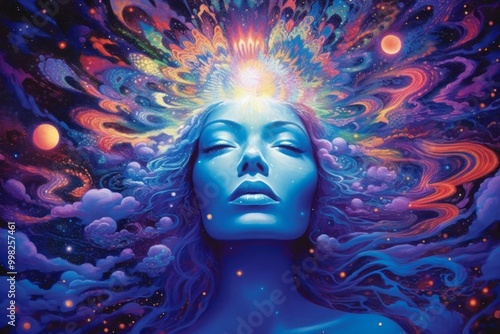 woman, cosmic, colours, energy, consciousness, universe, light, aura, star, planet, meditation, dream, surreal, spirituality, beauty, fantasy, art, imagination, creation, harmony, peace, inspiration, vision, nature, expression, aethereal, vibrant, glow, transcendence, wonder, mystery, flow, connection, mind, soul, essence, nirvana, atmosphere, creativity, design, depth, illusion, scene, calmness, celestial, perception, exploration, awakening