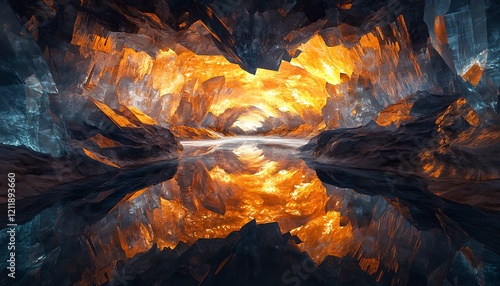 A surreal digital art of a glowing crystal cavern viewed from an explorera??s perspective with reflections creating an infinite effect