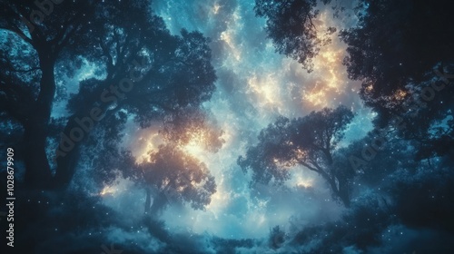 surreal, forest, glowing, tree, cosmic, cloud, gas, light, create, mesmerizing, atmosphere, exploration, imagination, fantasy, beauty, magic, wonder, dynamic, aethereal, immensity, harmony, dreamlike, illumination, enchantment, environment, serenity