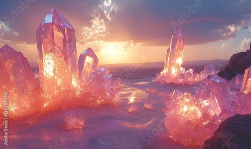 A surreal iridescent desert landscape with cinematic holographic effects and crystal structures