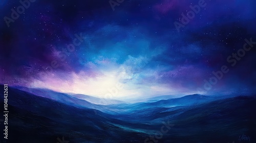 A surreal twilight sky with deep blue and violet tones, casting an ethereal glow across the landscape as the stars begin to appear