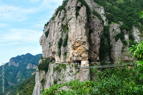 a suspension bridge on the edge of a cliff in the mountains, Zhejiang Province, China