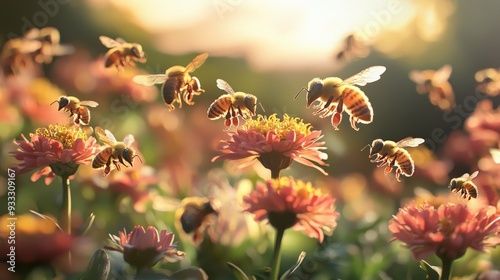 A swarm of bees carrying small objects from one flower to another, symbolizing a natural public transport service