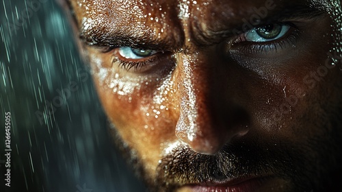 man, face, eye, intense, gaze, rain, sweaty, skin, close, up, portrait, dark, moody, dramatic, expression, emotion, serious, anger, sharpened, detail, texture, beard, moustache, eyebrow, lash, water, drop, droplet, glistening, brow, nose, mouth, lip, male, human, model, photo, image, picture, visual, art, head, strong, powerful, warrior