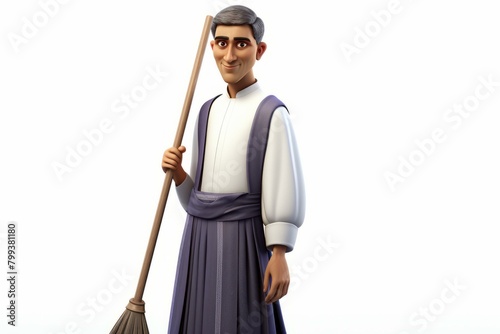 man, sweeper, broom, work, occupation, service, staff, person, portrait, avatar, character, three-dimensional, render, illustration, digital, art, brush, paint, labor, uniform, clothes, costume, middle eastern, ethnicity, male, one person