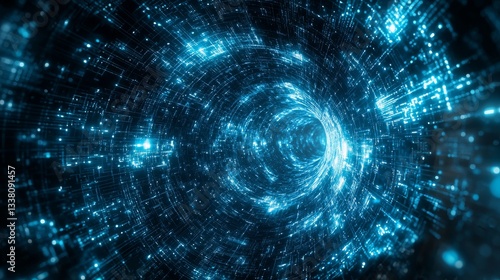 A swirling vortex of blue digital light, creating a mesmerizing, futuristic atmosphere that evokes a sense of movement and depth.