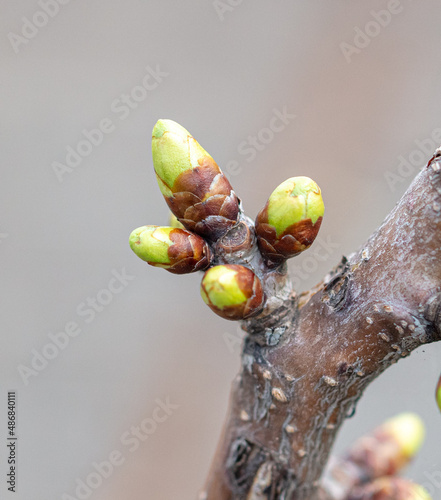 A swollen bud with a flower on a cherry branch.