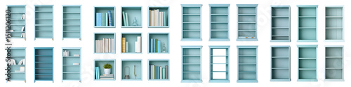 A symmetrical arrangement of clean white bookcases with uniform shelves and compartments creating a minimalist and organized interior design element