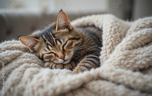 A tabby cat sleeping on a sofa with a soft wool blanket