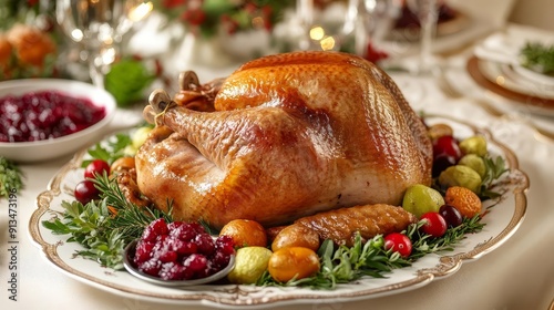 A table set for a holiday feast with a roasted turkey, cranberry sauce, and seasonal vegetables, all beautifully arranged