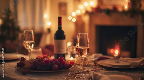 A table set for an elegant dinner with red wine, sparkling water, and a fruit platter.
