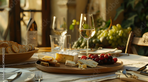cheese, bread, wine, grape, meal, afternoon, table, glasses, wooden, plate, food, drink, dining, still life, vinery, refreshment, epicure, delicious, luxury, lifestyle, celebration, gathering, elegant, rustic, tableware, cutlery, napkin, indoor, arrangement, platter, brie