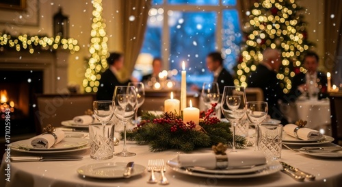 A table with a Christmas tree in the background and candles on it. There are people sitting at the table and enjoying the meal