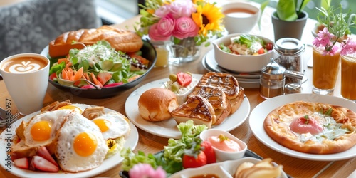 a table with a variety of food and drinks on it, including eggs, bread, salad, and coffee