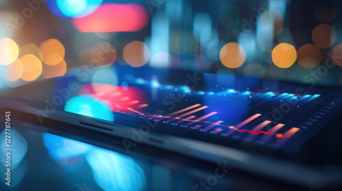 tablet, background, light, computer, reflective, surface, mirror, screen, graph, mix, blue, red, orange, colours, sharpened, city landscape, night time, evening, setting, frame, city, orange color