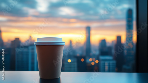 A takeaway coffee cup sits on a table against the backdrop of a city sunrise. The warm, golden hues of the dawn paint the cityscape in soft light, creating a tranquil and peaceful atmosphere.