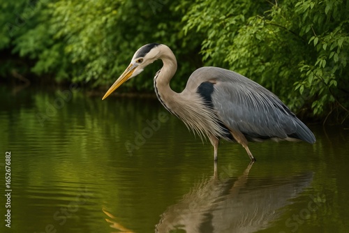 A tall blue heron amidst dense foliage by a waterbody, looking for fish to catch