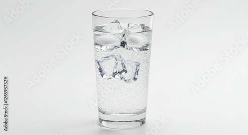 A tall glass filled with clear sparkling water and ice cubes on white background the glass is tall and slender with a wide base the ice cubes are neatly arranged in the glass refreshing drink
