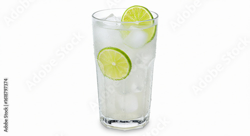A tall glass of chilled limonada de coco, made with coconut water, fresh lime juice, and a hint of sugar, served with ice cubes and a slice of lime.
