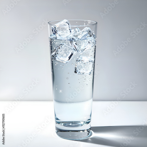 A tall glass of chilled water with ice cubes sparkling in soft light, photography of still life concept.