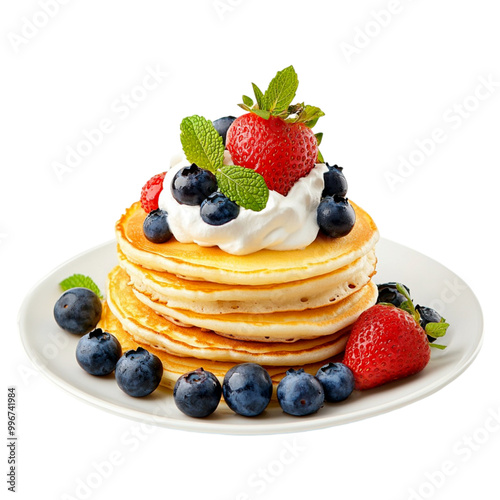 A tall stack of pancakes with raspberries, blueberries, a drizzle of syrup on a transparent background