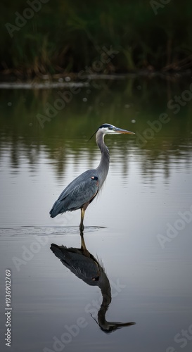 A tall wading bird, the great blue heron, stands motionless in shallow marsh water, reflecting the stillness of the natural wetland environment ,natural ,motionless ,Ardeidae