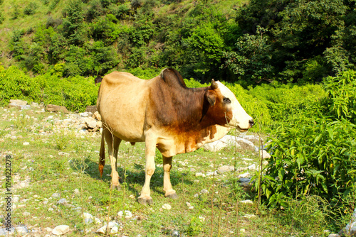 A tan and brown domestic cow (or bullock) standing in a rocky, grassy field, backed by lush green foliage and a forested hillside.