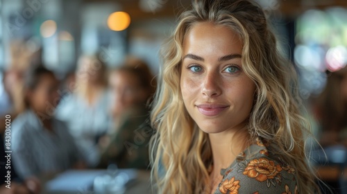 A tasteful close-up shot of a young woman with a subtle smile against a blurred background of social gathering