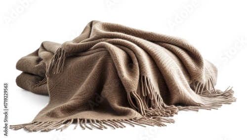 A taupe throw blanket with a subtle herringbone pattern and fringe is artfully draped on a white background, showcasing its soft texture and luxurious feel