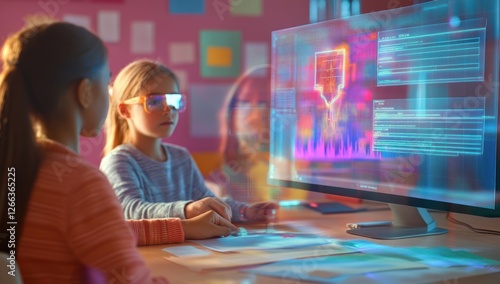 girl, teacher, children, education, learning, technology, future, reality, goggles, computer, screen, digital, display, holographic, lesson, classroom, school, student, children, young, woman, female, science, innovation, progress, cognition, wisdom, intelligence, information, datum, virtual, monitor, interface, interaction, software, application, program, system, code, graphic, design, modern, contemporary