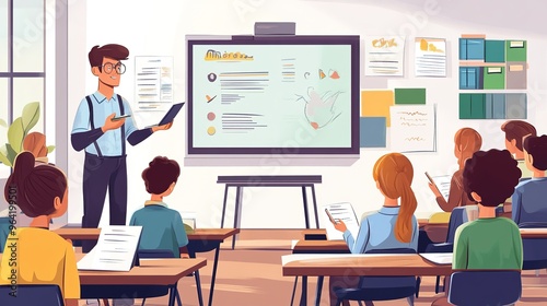A teacher giving a presentation to a classroom using multimedia tools, with students taking notes