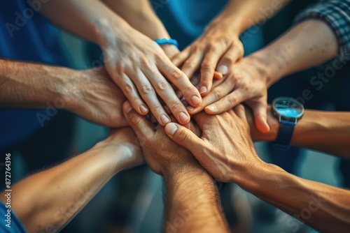 A team of colleagues joining hands in unity, symbolizing teamwork and collective effort.