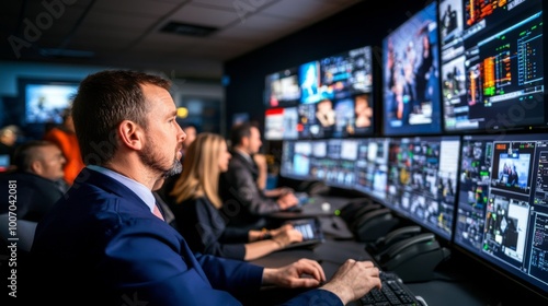 A team of dedicated operators works intently at their desks filled with monitors displaying complex data, highlighting their focus and collaboration in the control room