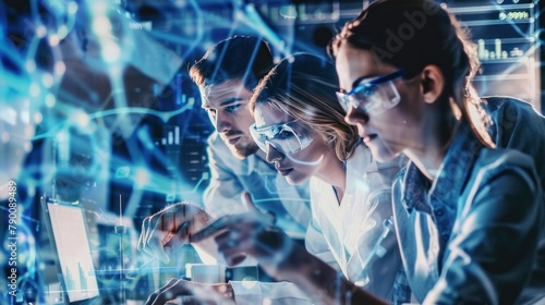 A team of engineers collaborating on a complex project, their teamwork and expertise evident in their focused expressions