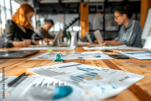 A team of marketers analyzing data and charts in a conference room, emphasizing strategy and analytics