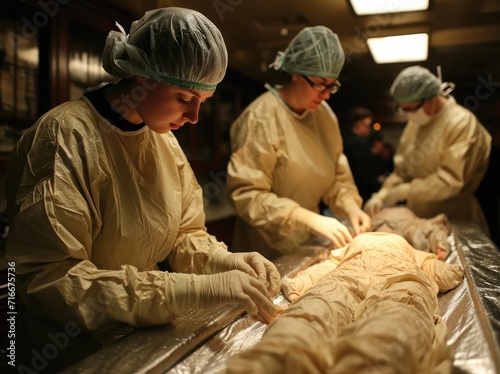 A team of medical professionals clad in scrubs and gloves carefully perform a life-saving surgery in a brightly lit hospital room, surrounded by state-of-the-art medical equipment and focused express
