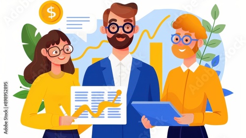 A team of professionals, including a central figure in a suit, collaborating on financial growth strategies with charts, ideas, and plans in a vibrant setup.