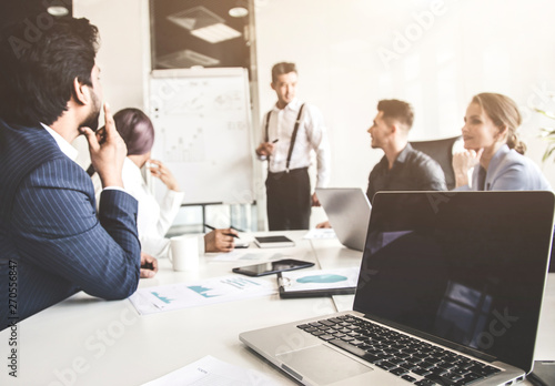 A team of young businessmen working and communicating together in an office. Corporate businessteam and manager in a meeting.
