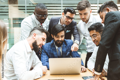 A team of young office workers, businessmen with laptop working at the table, communicating together in an office. Corporate businessteam and manager in a meeting. coworking.