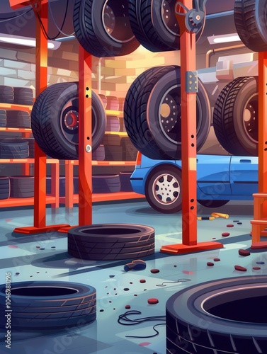 technician, tire, change, shop, evening, tool, stacked, tire, auto, repair, mechanic, tied-up, car, maintenance, workshop, automotive, service, installation, client, vehicle, night time, environment, ambience, substitution, fitting, work, crowded, inventory, professional, garage, station, dealer, atmosphere, ethic, efficient, tool, usage, interaction, skilled, labor, generative, ai