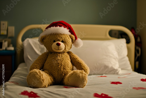 A teddy bear with a Santa hat sitting on a hospital bed.