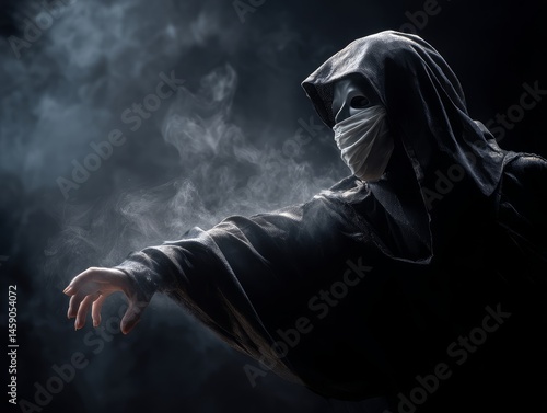 A teenager in a dramatic phantom costume, with a half-mask, flowing dark cloak, and hand reaching out, isolated smoky black background